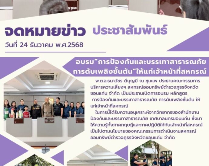 วันที่ 24 ธันวาคม พ.ศ.2568 พ.ต.อ.ธนาวัชร ดีบุญมี ณ ชุมแพ ประธานคณะกรรมการบริหารความเสี่ยงฯ สหกรณ์ออมทรัพย์ตำรวจภูธรจังหวัดขอนแก่น จำกัด เป็นประธานเปิดการอบรม “การส่งเสริมความรู้เรื่องการป้องกันและบรรเทาสาธารณภัย การดับเพลิงชั้นต้น” ให้แก่เจ้าหน้าที่สหกรณ์