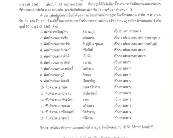ประกาศรายชื่อ คณะกรรมการดำเนินการ ชุดที่ 50 ประจำปี 2569