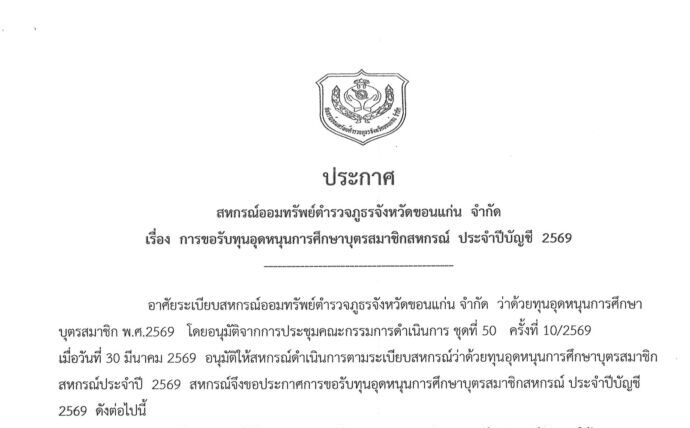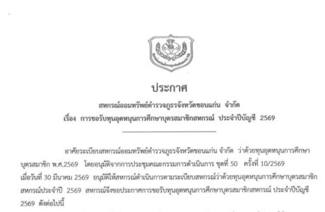ประกาศ เรื่อง การขอรับทุนอุดหนุนการศึกษาบุตรสมาชิกสหกรณ์ ประจำปีบัญชี 2569