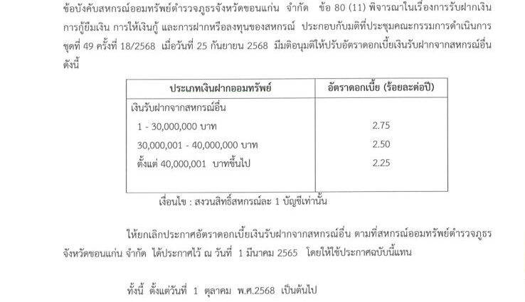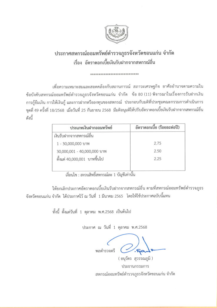 ประกาศ อัตราดอกเบี้ยเงินรับฝากระหว่างสหกรณ์